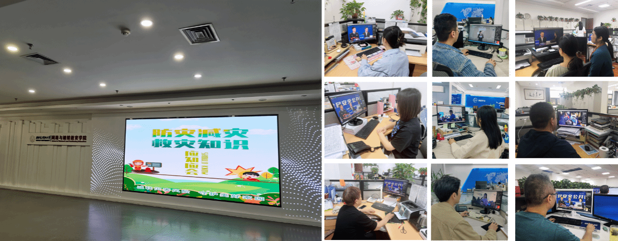 宣传周期间,网教院分别在工作群里推送、大屏幕滚动播放《防灾减灾救灾应知应会》课件。5月14日上午,学院组织教职工以多种形式收听收看了国家应急管理部联合中央广播电视总台推出的《全民安全公开课》,通过防灾减灾救灾知识科普和公开课学习,增强了教职工防灾减灾意识,使安全知识宣传教育入脑入心。