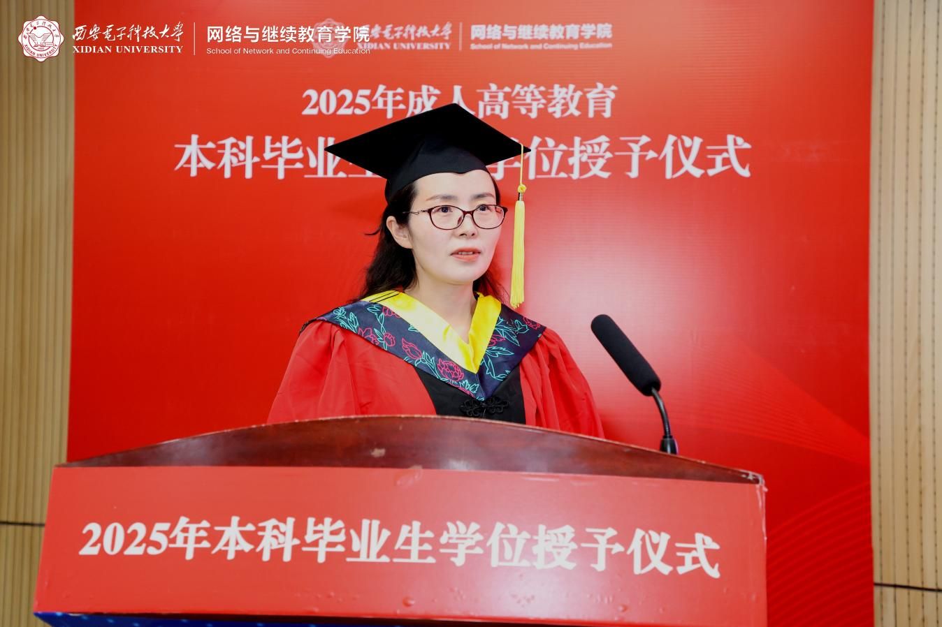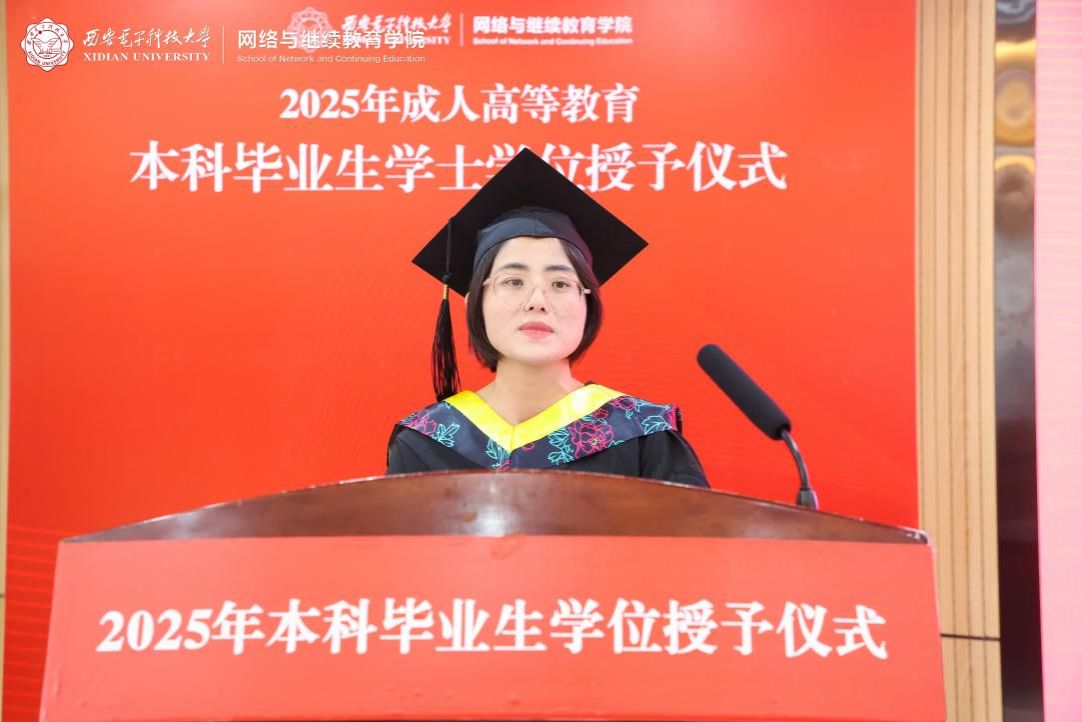 授位仪式在庄严的国歌声中正式拉开帷幕。304永利副院长何燕芝宣读了《304永利关于授予304永利2025年王欣亚等399人成人高等教育本科毕业生学士学位的决议》。教师代表詹海生副教授衷心祝贺同学们顺利完成学业,并期许大家秉持终身学习的理念,不断前行,勇于面对新挑战,在实践中学习,在学习中成长。姜敏代表全体毕业生向学院和老师们的培养表示衷心的感谢,同时分享了她在继续教育道路上的学习历程与深刻感悟,并表示在今后的工作和生活中,继续传承西电红色基因,用实际行动回馈社会,为母校争光。