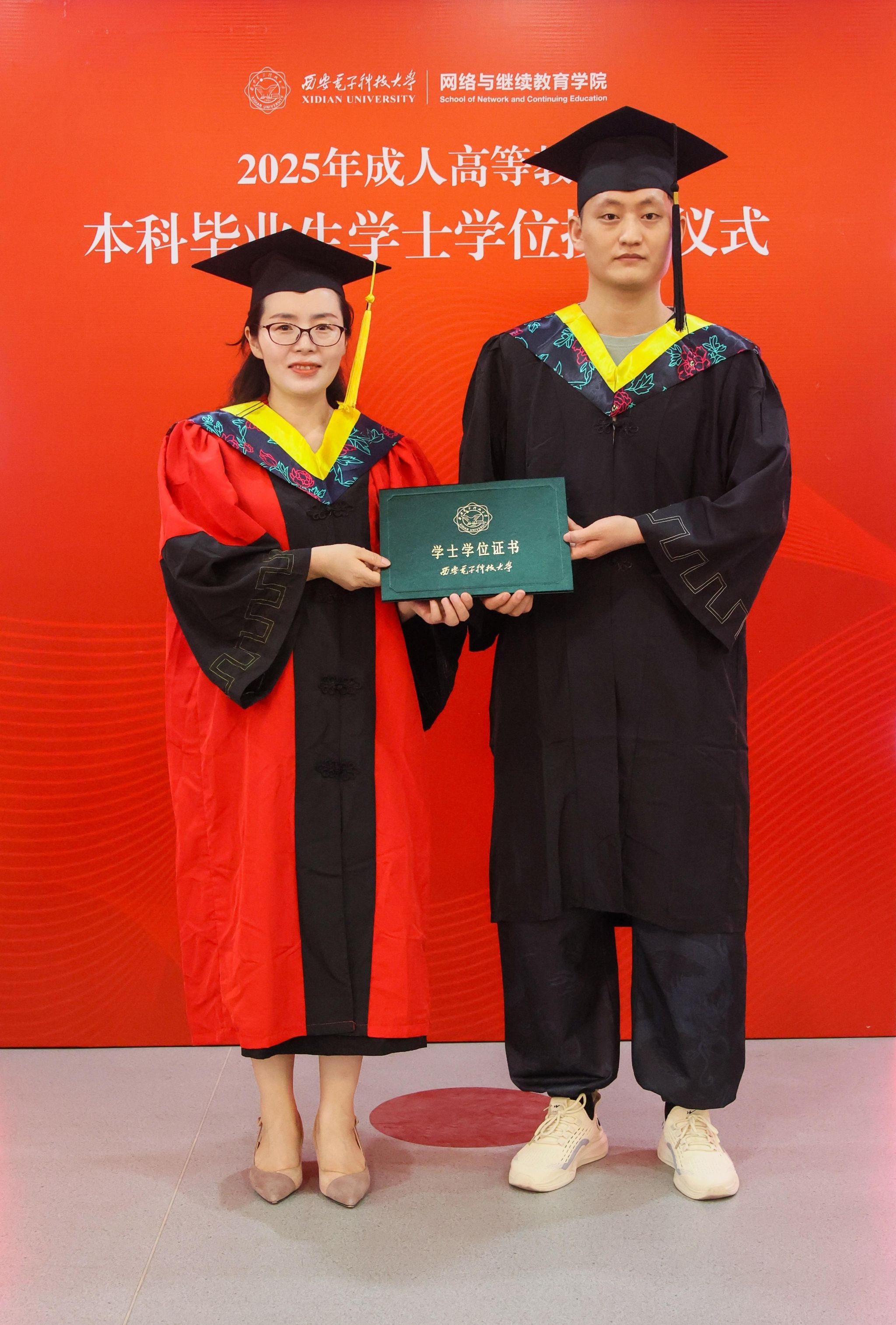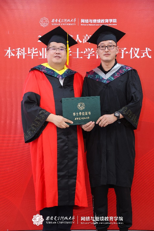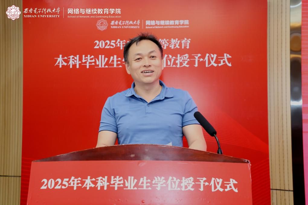 沈强以“岁月砺学铸荣光,扬帆起航赴山海”为题深情寄语毕业生。首先,他代表学院向毕业生表示祝贺,赞扬他们在克服工学矛盾、付出巨大努力后,圆满完成了学业。目睹同学们取得的优异成绩,他由衷地为同学们感到自豪。接着,他对毕业生提出三点希望:一是希望同学们做西电精神的传承者,将“厚德、求真、砺学、笃行”的校训内化于心、外化于行,将个人理想融入国家发展伟业;二是希望同学们做知行合一的实干家,将“学在西电”打下的坚实基础与工作岗位上的实际问题深度融合,敢于直面工作中的痛点、难点、堵点,在6G、人工智能、大数据、网络安全等前沿技术领域勇于创新;三是希望同学们做终身学习的引领者,主动适应数字化转型、智能化升级的浪潮,不断更新知识图谱,提升技能素养。最后,沈强院长希望同学们在未来要继续发扬西电精神,并欢迎同学们常回母校看看。