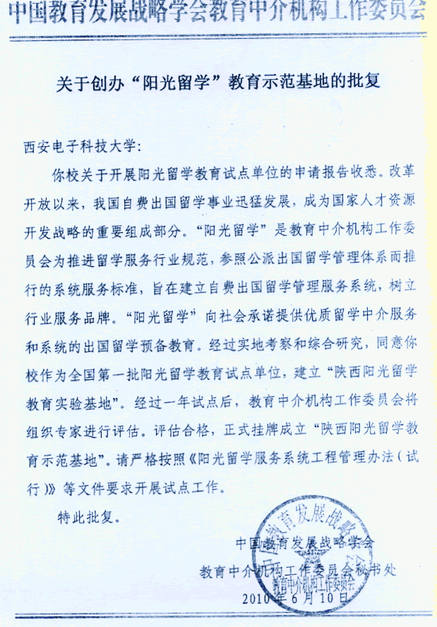 关于创办“阳光留学”教育示范基地的批复