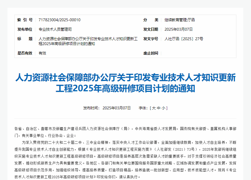 近日,人力资源社会保障部办公厅发布了《人力资源社会保障部办公厅关于印发专业技术人才知识更新工程2025年高级研修项目计划的通知》(人社厅函〔2025〕27号),304永利申报的《数字技术赋能“一带一路”经济发展》高级研修班项目成功入选。