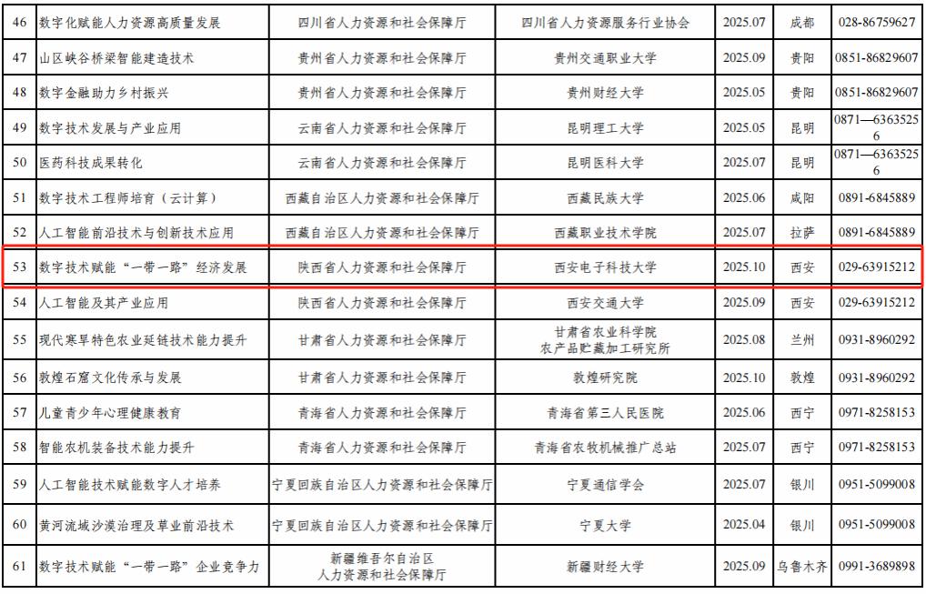 我校积极响应国家号召,紧扣“一带一路”倡议和数字经济发展的时代脉搏,充分发挥学校在数字技术领域的学科优势和教学科研实力。学校先后被人社部批准为国家大数据、区块链、人工智能、智能制造、集成电路数字技术工程师首批培训机构,以及大数据、区块链、集成电路考核站点。在此基础上,学校精心组织并申报了《数字技术赋能“一带一路”经济发展》高级研修班项目,经过陕西省人力资源和社会保障厅的推荐,以及国家人力资源和社会保障部的严格评审,该项目最终成功入选2025年高级研修项目计划。