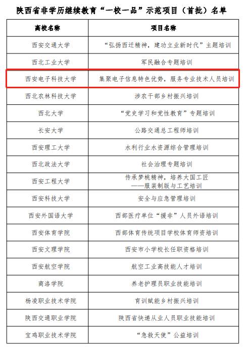 为落实国家终身教育方针政策,总结和宣传陕西省非学历继续教育的优秀实践教学成果,进一步提升非学历继续教育社会影响力,推进培训项目特色化、品牌化发展,发挥示范引领作用,我省开展了非学历继续教育“一校一品”首批示范项目评选工作。经高校申报、专家组评审,最终确定了18个项目入选陕西省非学历继续教育“一校一品”首批示范项目,我校304永利申报的《聚集电子信息特色优势,服务专业技术人员培训》成功入选。