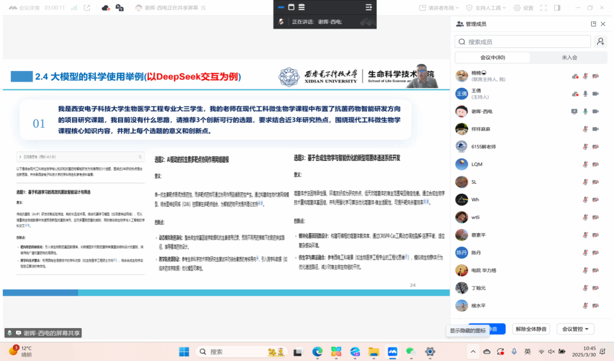 为深化人工智能与教育场景的融合创新,培训赋能高等教育数字化转型落地,西电304永利于2025年3月30日成功举办“DeepSeek科普工具箱:解锁AI超能力”专题培训班。本次活动通过OMO培训模式,吸引来自校内外230余名教育工作者及技术骨干深度参与,形成线上线下双轨并进的智慧教育研讨热潮。学院院长沈强、副院长尹瑾参加培训,培训会由培训部主任王凌霄主持。